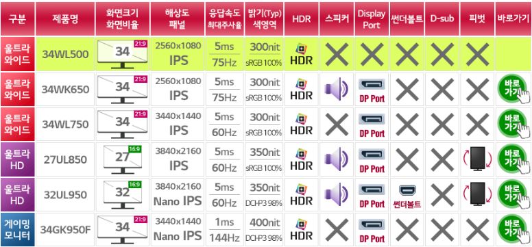 보실 수 있습니다. 34wl500과 34wl750 사이에 저는 굉장히 고민을 많이 할 것 같습니다.