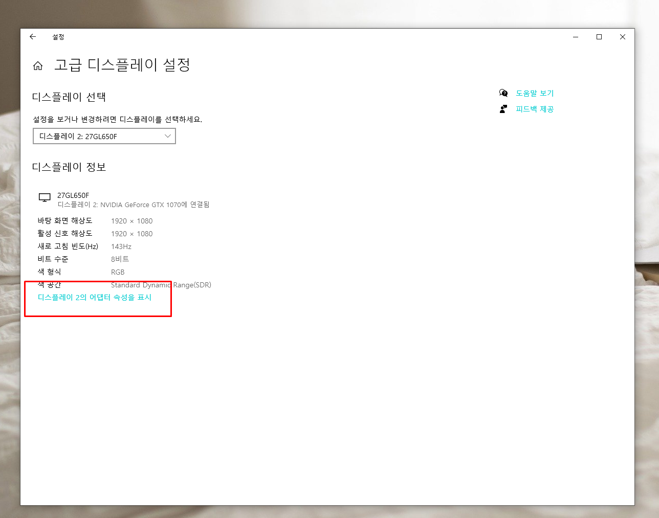 디스플레이 2의 어텝터 속성을 표시 클릭합니다.