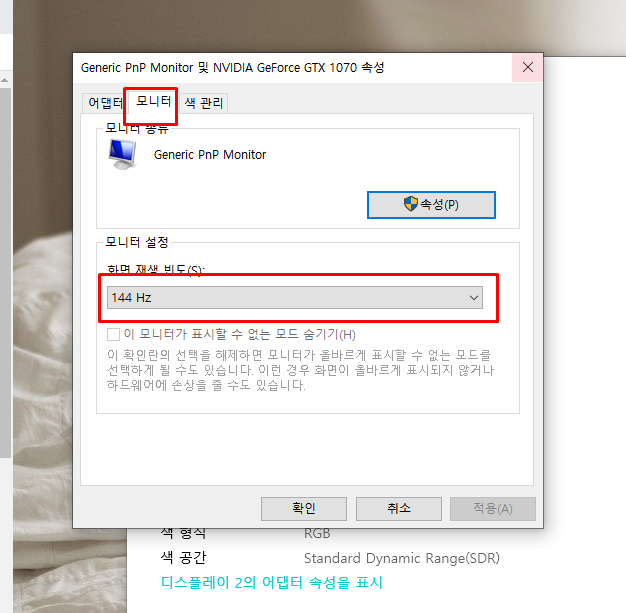 모니터 탭을 클릭하여 화면 재생 빈도에서 144hz로 세팅해주면 끝입니다.